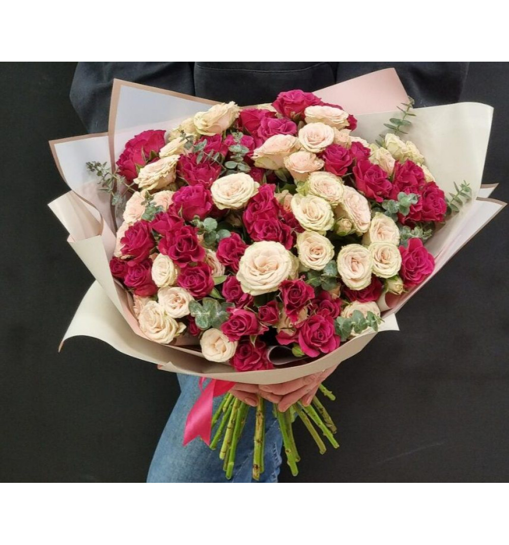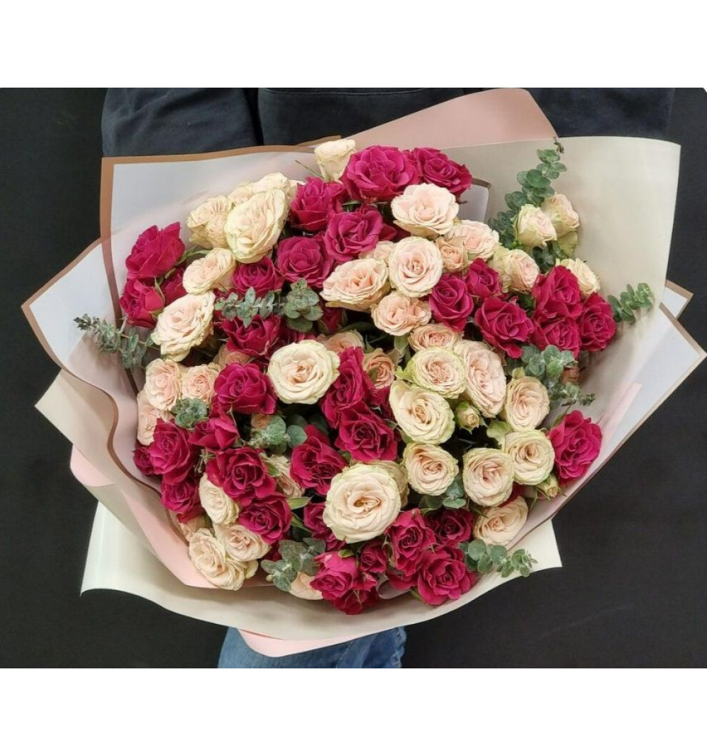 Изысканный букет из эвкалипта, упакованный в стильные дизайнерские обертки. Этот уникальный состав включает 11 кустовых роз сорта Елена и 10 кустовых роз сорта Глориус, создавая нежную и элегантную композицию. Отличный выбор для особых моментов, чтобы подарить красоту и радость вашим близким.