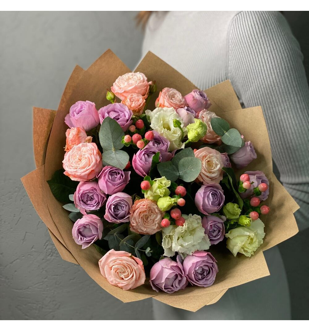 Прекрасный букет из пионовидных роз — это гармоничное сочетание изящества и страсти. Завораживающие оттенки роз, включая мадам бомбастик и лавандер баблс, создают атмосферу романтики и таинственности. Гиперикум и эустома добавляют нежности и свежести, а эвкалипт Микс придает композиции особый шарм. Каждый цветок тщательно подобран, чтобы создать уникальную и элегантную композицию. Этот удивительный букет станет замечательным подарком для особых моментов, чтобы выразить свои чувства и создать незабываемые впечатления у вашего получателя.