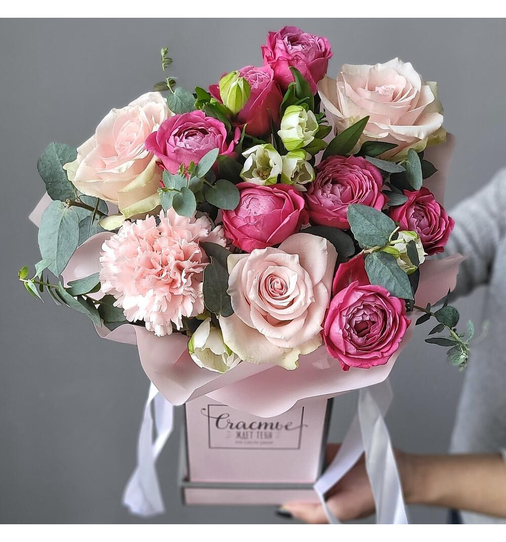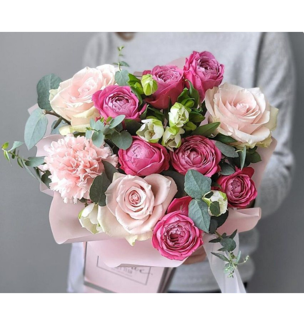 Композиция с розами, пионовидными кустовыми розами и альстромерией