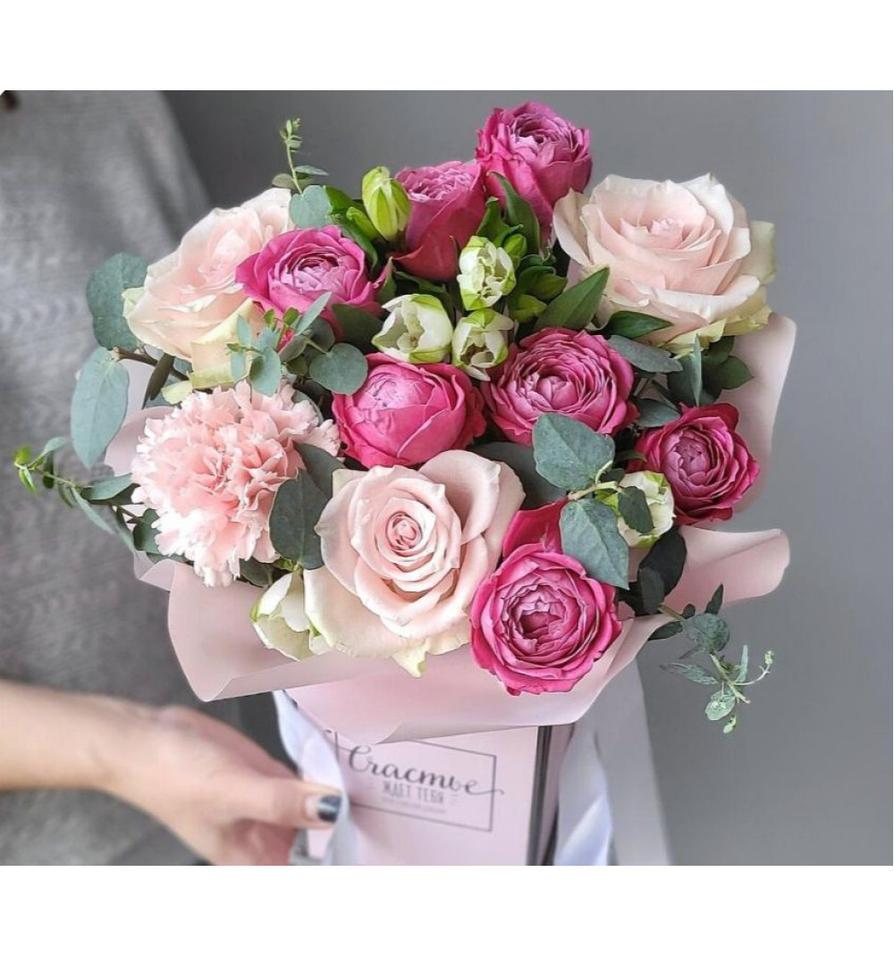 Композиция с розами, пионовидными кустовыми розами и альстромерией - это изысканный и элегантный букет, который привлекает внимание своим разнообразием цветов и форм. Розы, с их изящными лепестками, символизируют любовь и красоту. Пионовидные кустовые розы добавляют в букет объемности и роскоши, а альстромерия своими мелкими цветками придает ему нежность и легкость. Эта композиция будет прекрасным подарком для особых моментов и создаст атмосферу уюта и радости в любом интерьере.